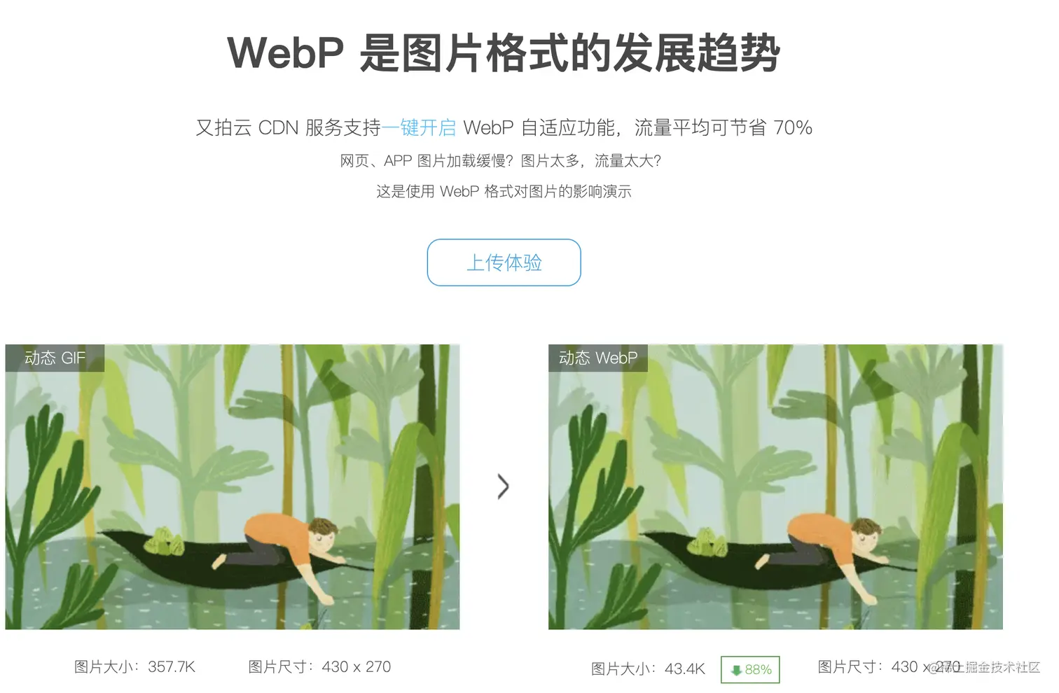 WebP 是 Google 团队开发的加快图片加载速度的图片格式,其优势体现在它具有更优的图像数据压缩算法,能带来更小的图片体积,而且拥有肉眼识别无差异的图像质量,同时具备了无损和有损的压缩模式、Alpha 透明以及动画的特性,在 JPEG 和 PNG 上的转化效果都相当优秀、稳定和统一。