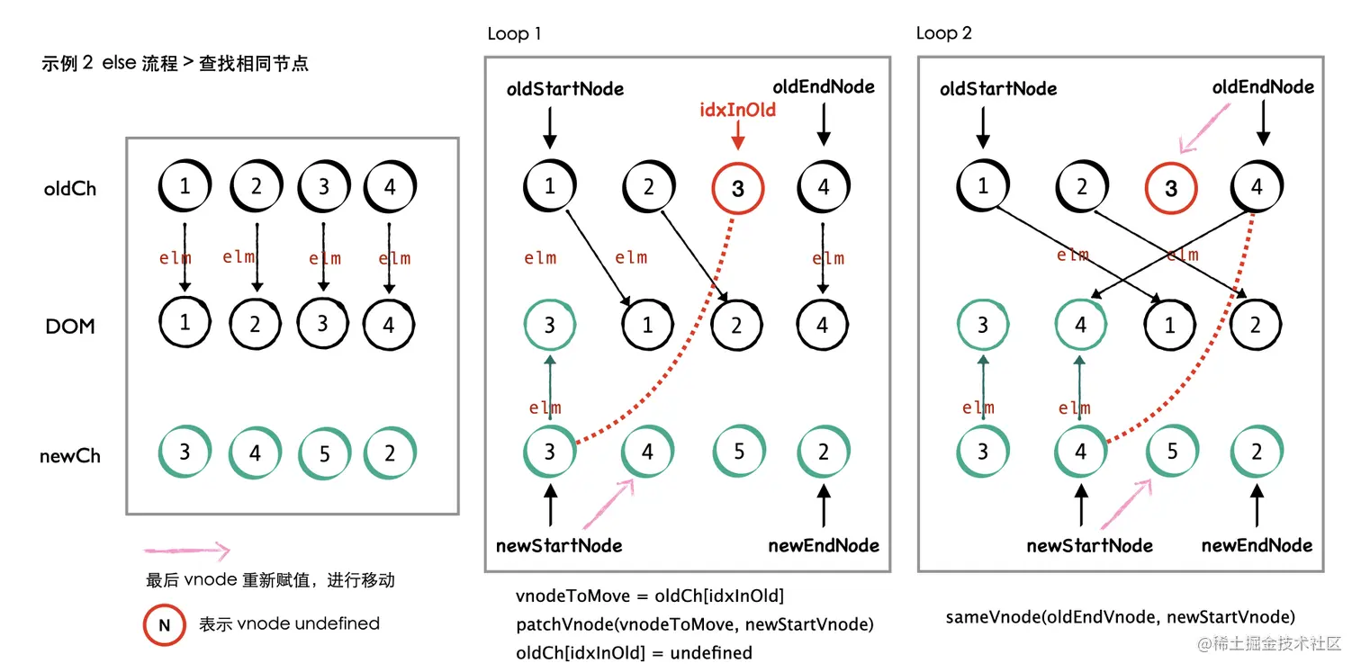 此外,以对象索引查找替代数组遍历,也是典型的减少数组遍历的方法;else 流程查找到相同的节点后,将旧子节点数组中此节点置为 undefined,方便后续循环时直接移动索引进行流转;使用 elm 属性将新旧节点 vnode 与 DOM 进行关联......都是很好的处理做法。