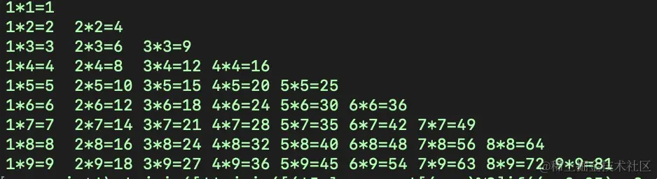print '\n'.join([' '.join(['%s*%s=%-2s' % (y,x,x*y) for y in range(1,x+1)]) for x in range(1,10)])