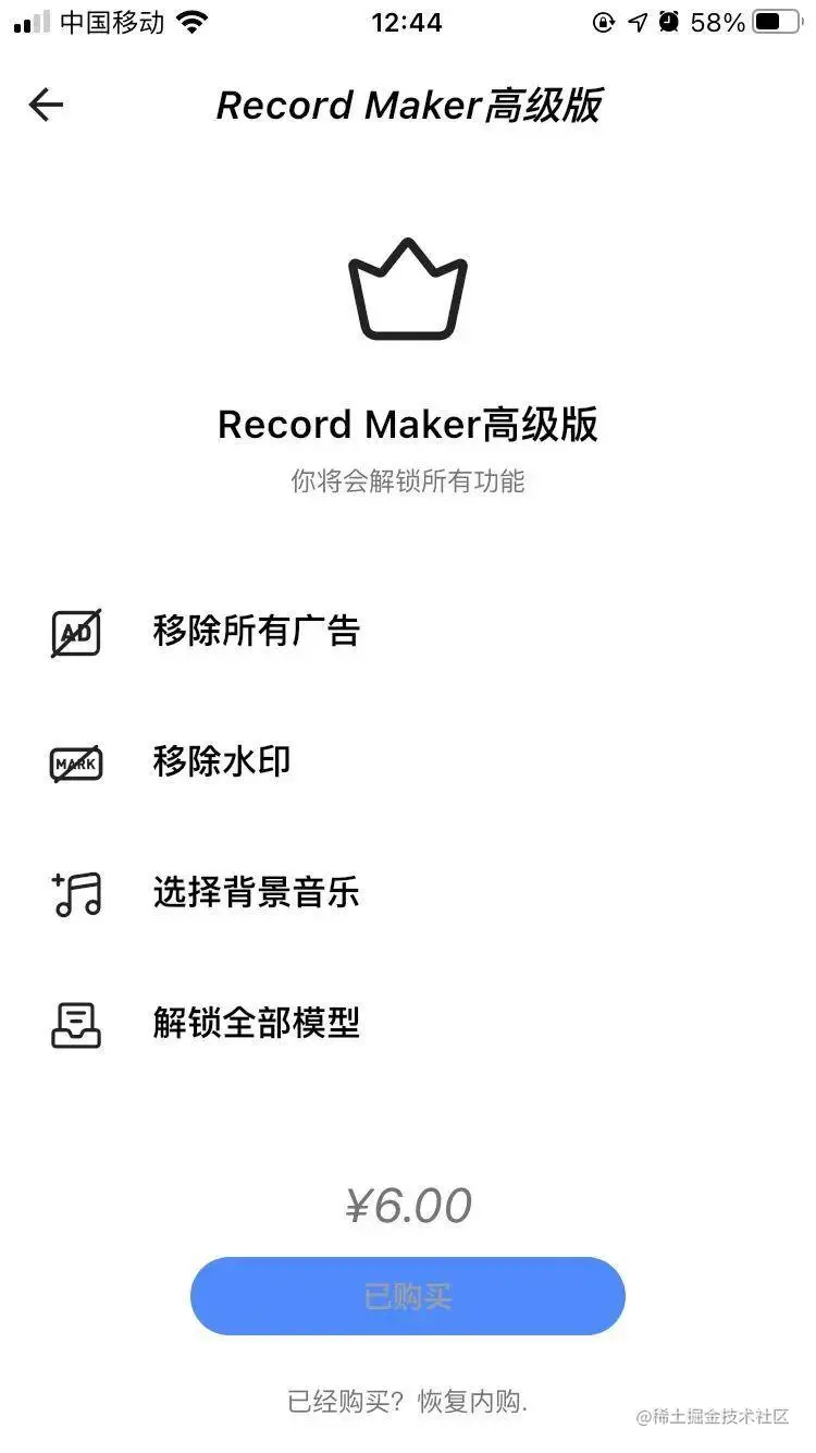 第一项是关于高级版功能的介绍,目前6元即可解锁所有功能,包括:移除所有的广告,移除水印,背景音乐的选择和解锁全部模型。