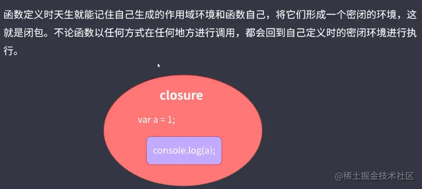 从广义上来说,定义在全局的函数也是一个闭包,只是我们没办法将这样的函数拿到更外面的作用域进行调用,从而观察闭包的特点。