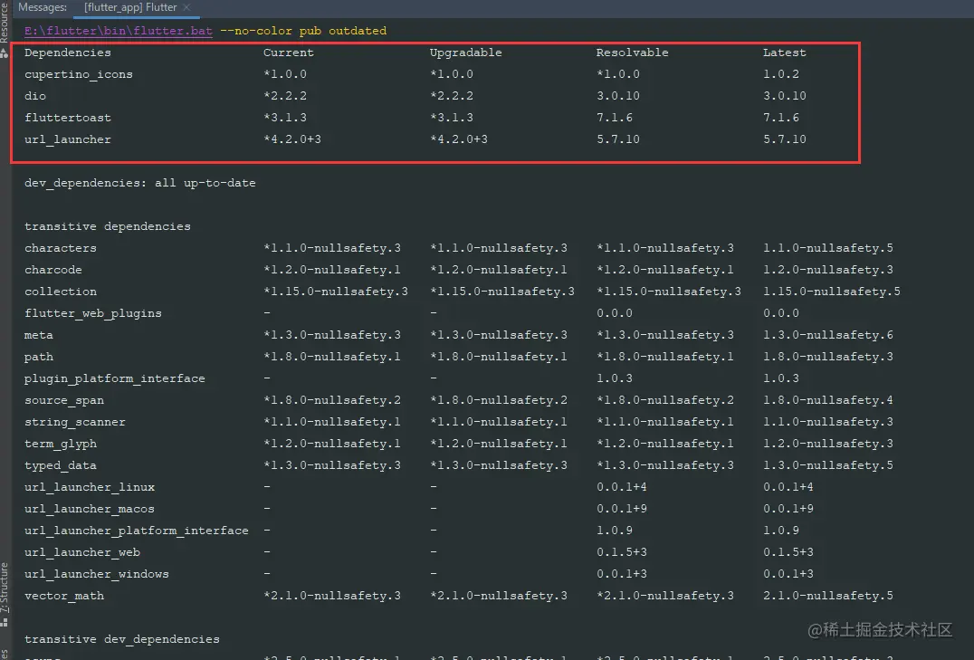 点击4 Pub outdated 可以查看第三方库的版本信息