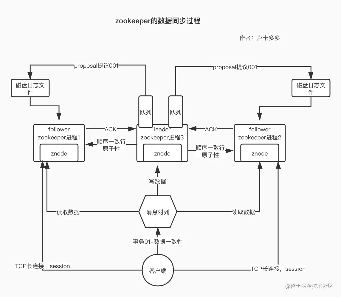 3⃣️当一个(写操作)请求经过Zookeeper集群后,leader角色机器会优先分配一个zxid用于创建节点或者变更节点的全局唯一自增ID,然后将发起一个提议Proposal(只是一个提议,相当于告诉其他人来活了,准备一下),将提议都放入,之前给每个follow角色准备好的队列中,(这里到可以保证顺序一致性)。