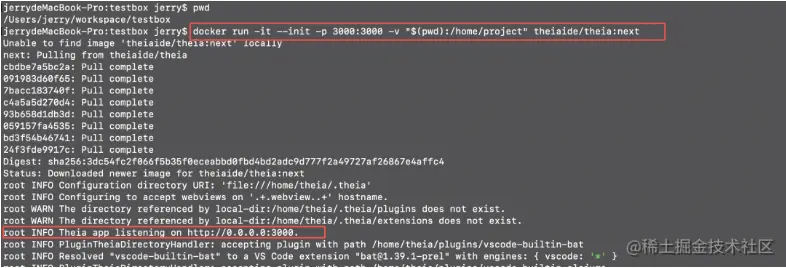 使用 docker 来启动一个基于 Theia 的 IDE 是最简单的了,你只需要确保你当前的系统中安装了 docker 即可。我们可以直接使用它提供的镜像 theiaide/theia 来启动: