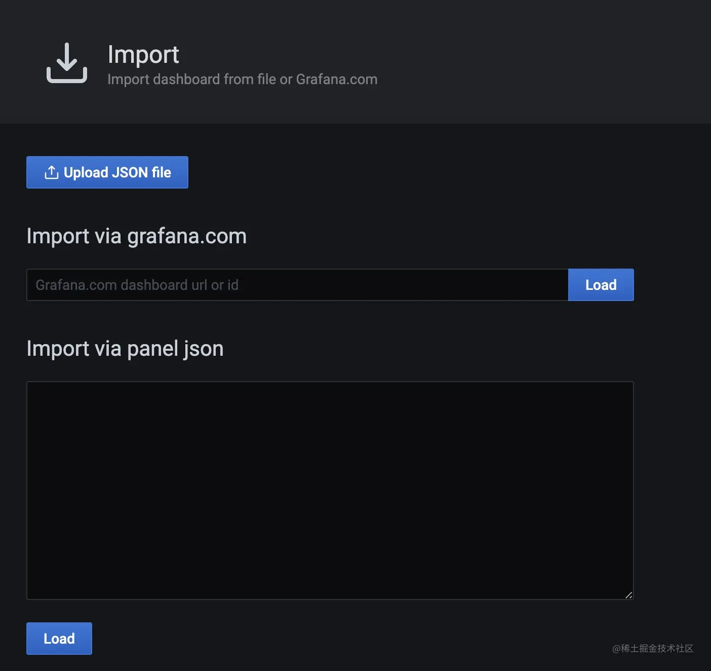 添加面板可以通过在grafana.com官方网站中进行查找,复制相对应的id点击Load按钮,比如jvm监控面板和SpringBoot监控面板