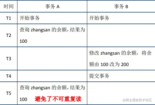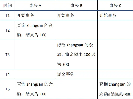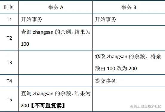 不可重复读:在事务A中先后两次读取同一个数据,两次读取的结果不一样,这种现象称为不可重复读。脏读与不可重复读的区别在于:前者读到的是其他事务未提交的数据,后者读到的是其他事务已提交的数据。举例如下: