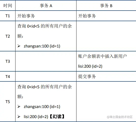 幻读:在事务A中按照某个条件先后两次查询数据库,两次查询结果的条数不同,这种现象称为幻读。不可重复读与幻读的区别可以通俗的理解为:前者是数据变了,后者是数据的行数变了。举例如下