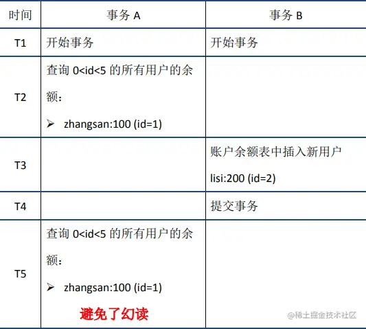 当事务A在T2节点第一次读取0<id<5数据时,标记的不只是id=1的数据,而是将范围(0,5)进行了标记,这样当T5时刻再次读取0<id<5数据时,便可以发现id=2的数据比之前标记的版本号更高,此时再结合undo log执行回滚操作,避免了幻读。
