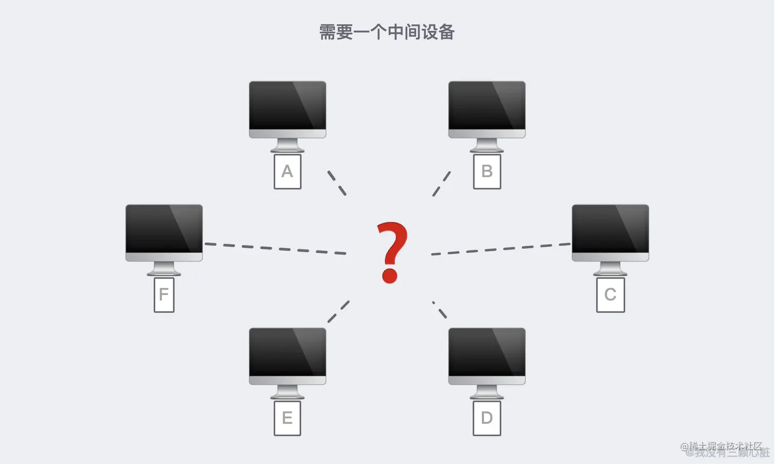 为了解决这样的问题,我们需要一个中间设备,让所有计算机接入它,由这个中间设备做转发,这样就能有效的减少网线的数量了: