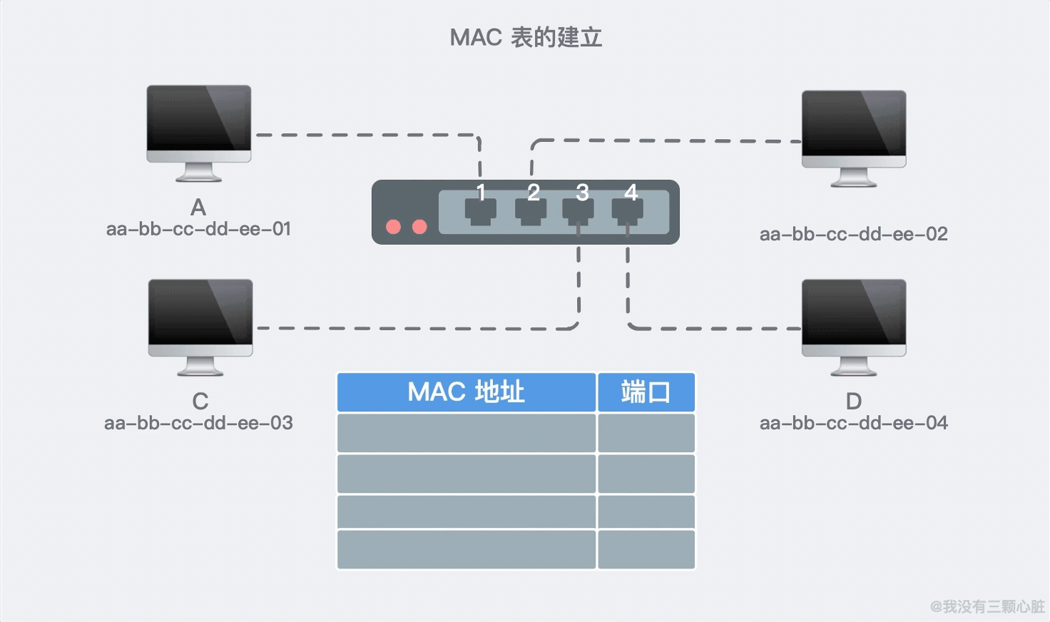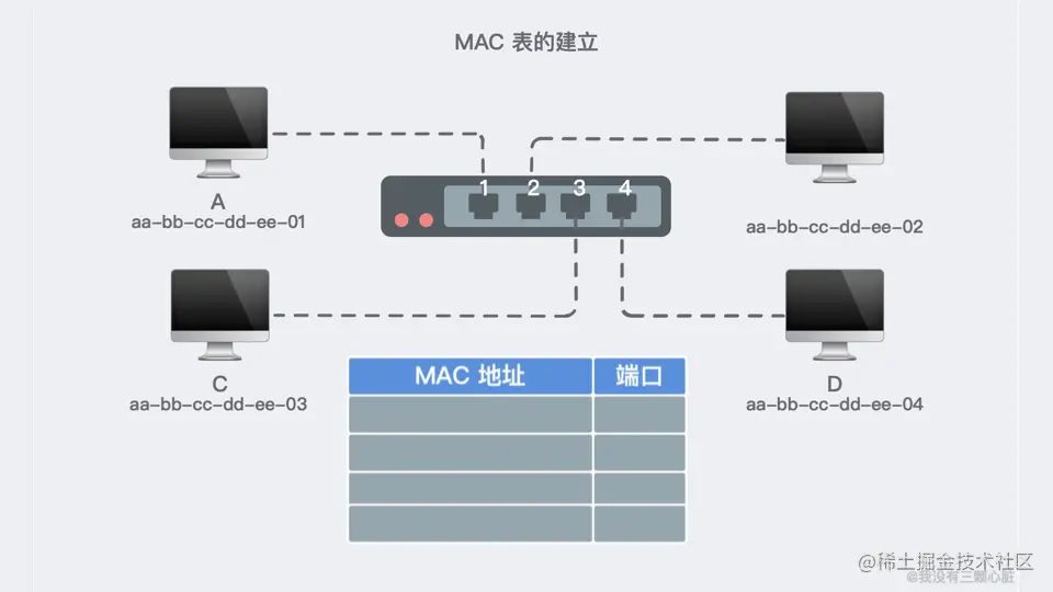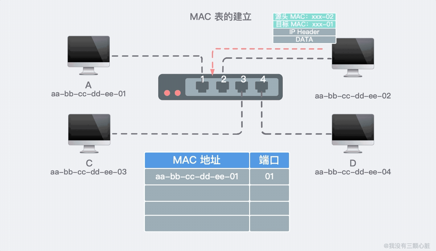 就在这样不断的数据交换中,交换机不断更新维护着自己的 MAC 地址表。