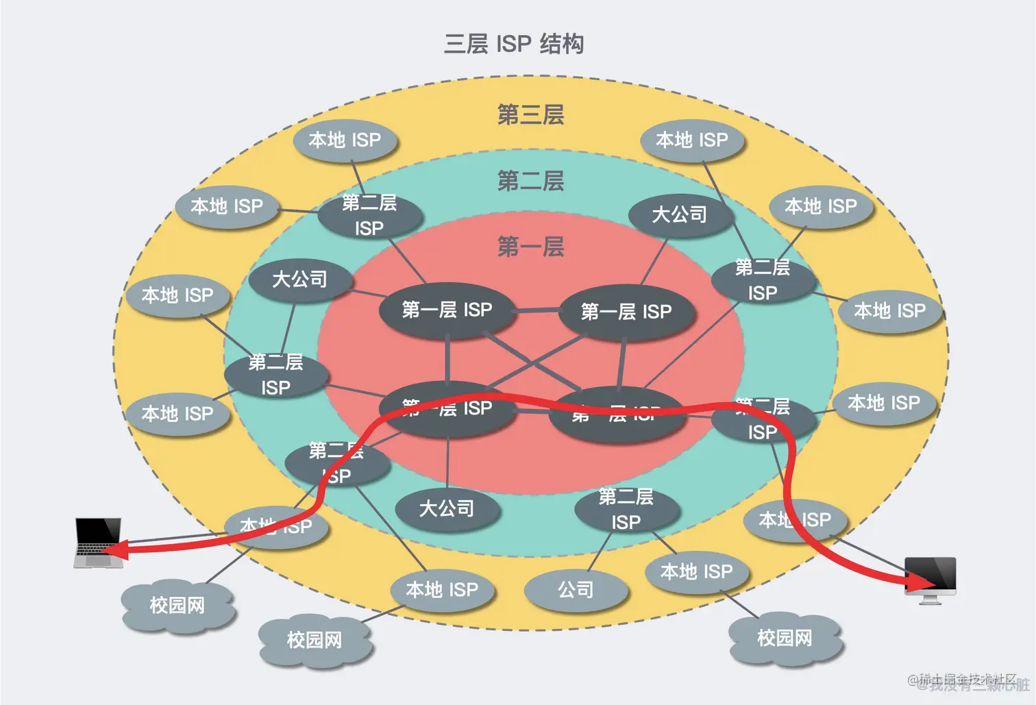 现在经过一系列的发展,已经形成了三层 ISP 结构的因特网了: