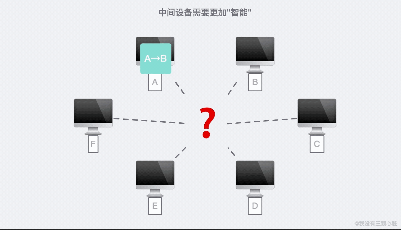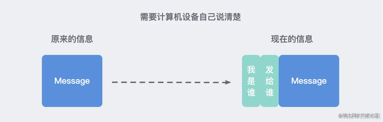 最初我只需要把信息通过合适的网线传送出去就可以了,但现在,所有的信息都统一发到中间设备那里,谁发给谁的,还必须计算机设备自己说清楚。(就像写邮件一样的)