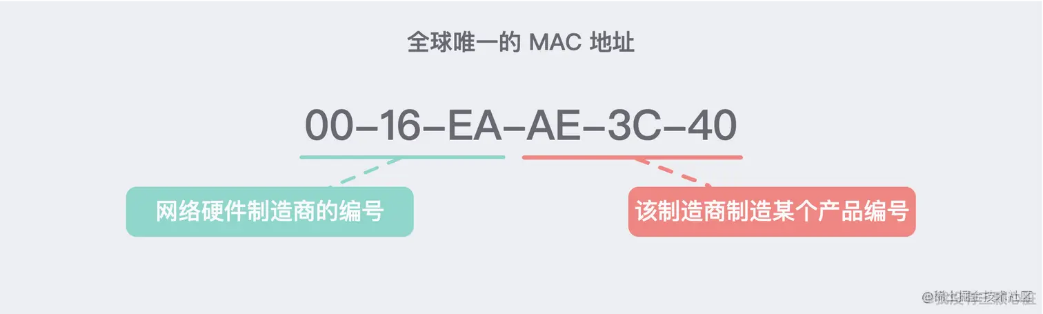 要做到这一点,首先我们每台设备都需要一个唯一的标识 (名字) 才行,这在每一个网络设备出厂之前,生产它的厂家就已经给它赋予一个全球唯一的 MAC 地址。