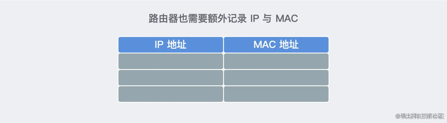 同样的,路由器也对应需要额外的记录 IP 地址与 MAC 地址的对应关系: