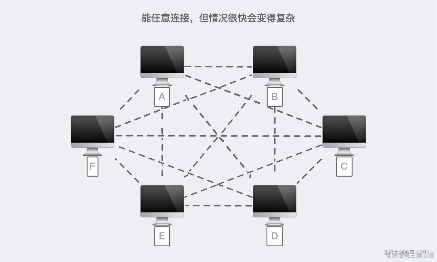 这样的网络不限于两台计算机之间,你可以接入任意数量的计算机,但很快也会变得复杂起来:
