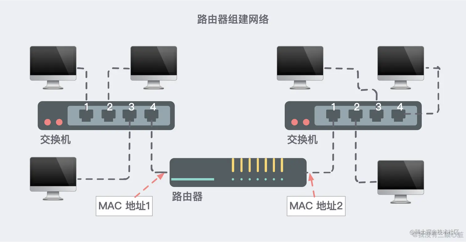 所以我们需要一种拥有独立 MAC 地址,帮助我们做转发的设备——路由器由此诞生。