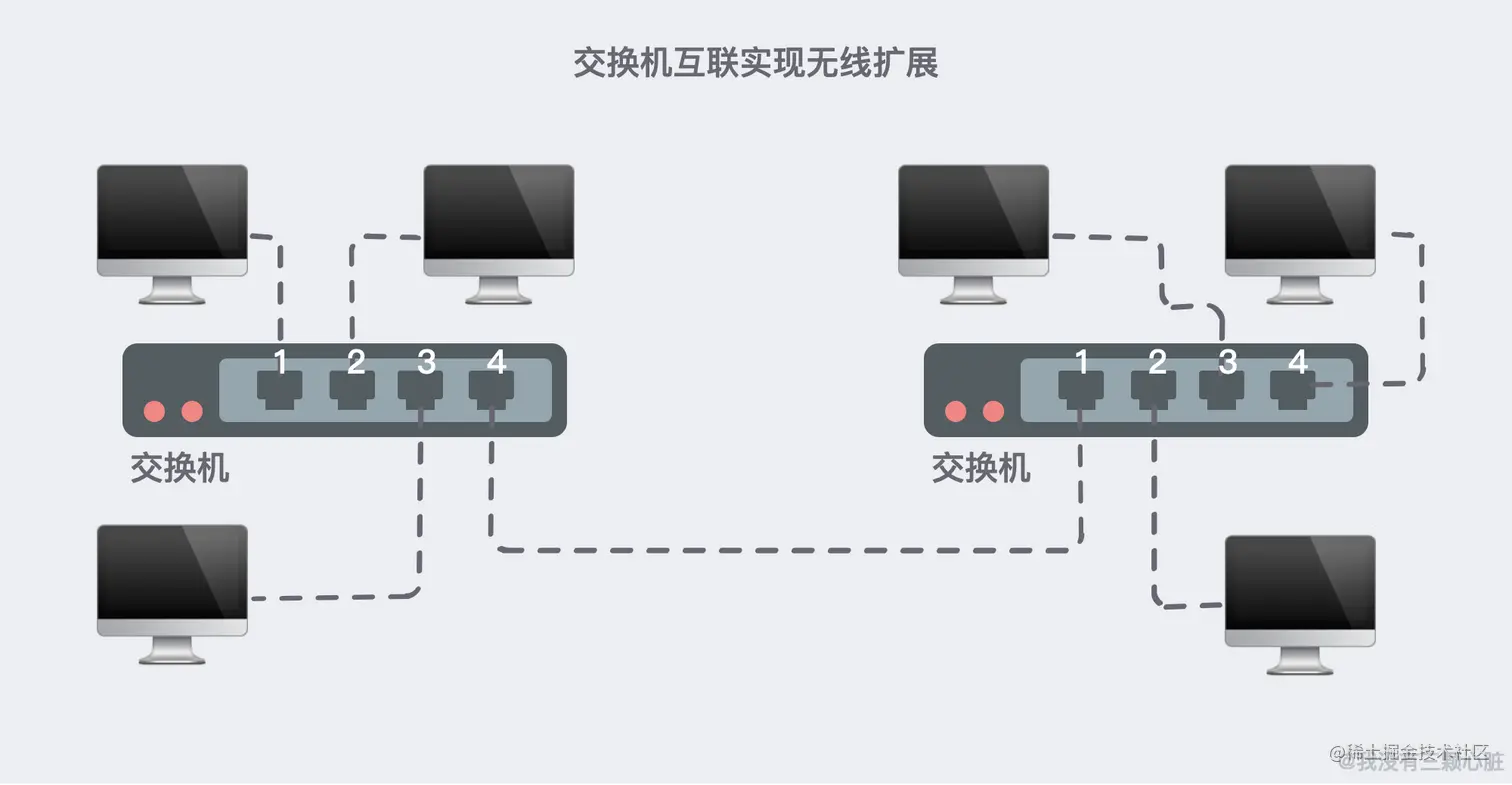 我们很容易想到,理论上,可以通过多个交换机互联来进行无限的扩展:
