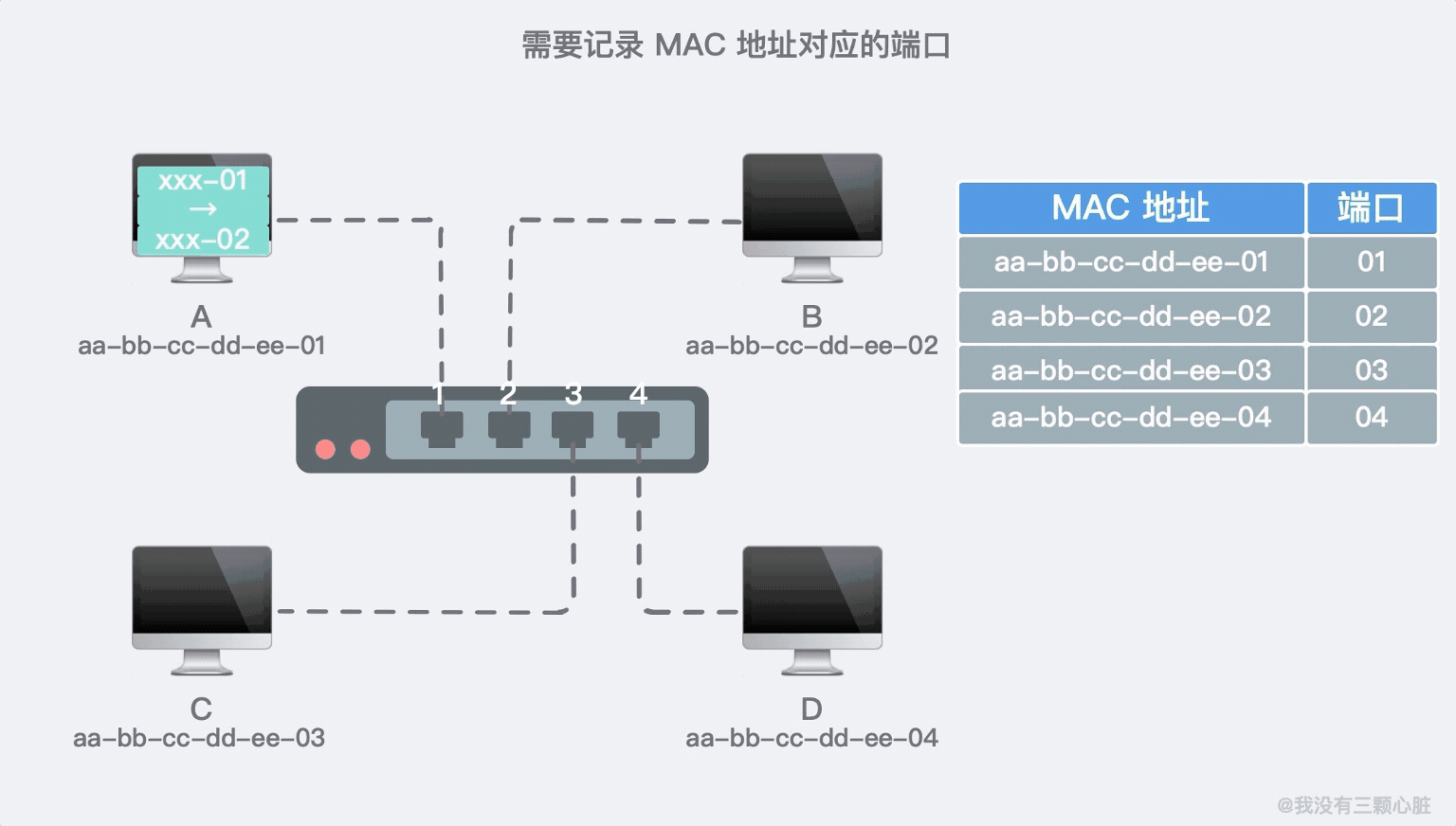 好了,此时对于交换机来说,又是一个新的源 MAC 地址的数据发来了,记录学习的同时也查询到要去往 A 机器的目标 MAC 地址已经存在了,于是直接转发到 01 端口就好了: