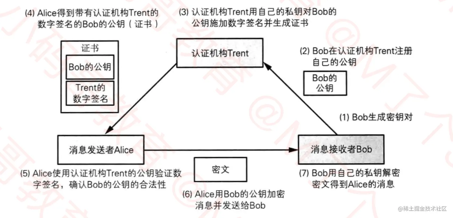 - 并由认证机构(Certificate Authority,CA)施加数字签名