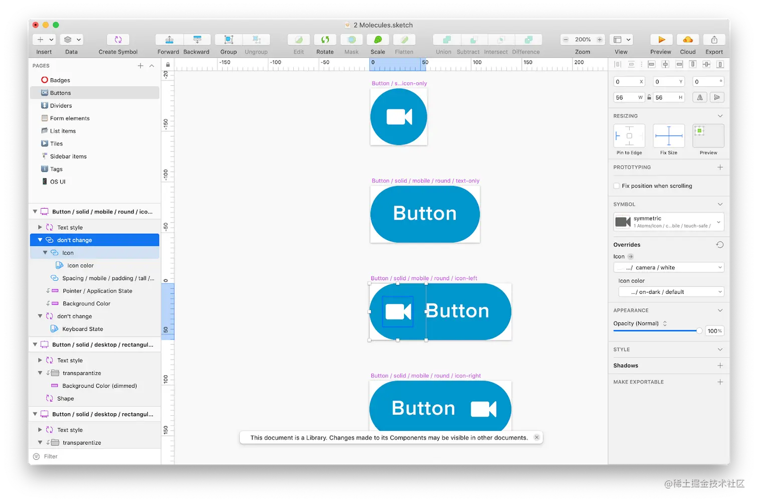 我们的 Sketch 分子库:按钮组件中的图标组件是从 Sketch 原子库中复用的。