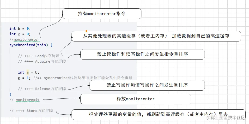 在moniterenter指令之后,加入了一个load屏障,执行一个refresh操作从其他处理器的高速缓存读取最新数据或者从主内存加载数据