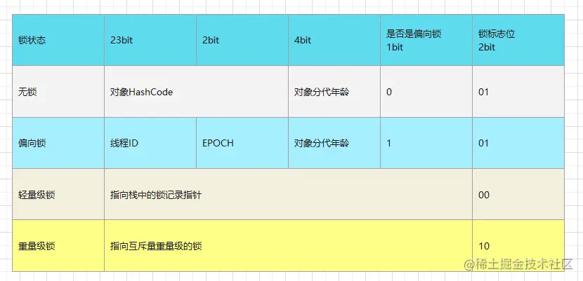| 锁状态 | 25bit | 4bit | 1bit是否是偏向锁 | 2bit 锁标志位 |