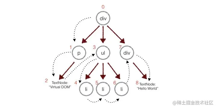 对于比较两棵树的不同我们采用的是深度优先遍历,遍历到的每一个节点都会有一个记号(也就是当前节点的索引),在遍历的过程中比较两棵树节点的不同,然后记录在一个对象里: