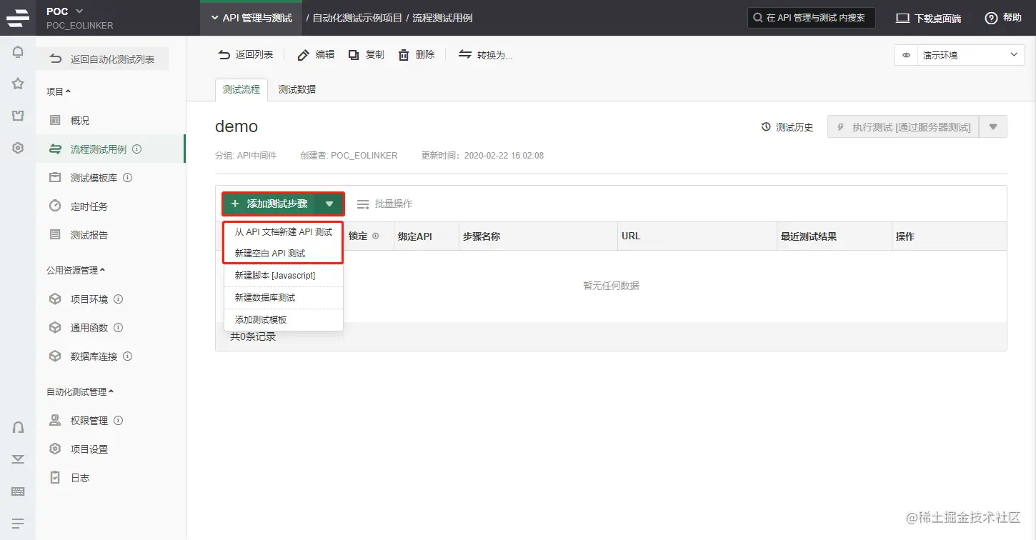 运用零代码/低代码,则是直接在接口自动化测试工具如Eolinker上导入接口文档,直接在界面上生成测试用例,再设置一下测试流程的相关参数和返回值,就可以一键发起自动化测试并实时得到测试结果。