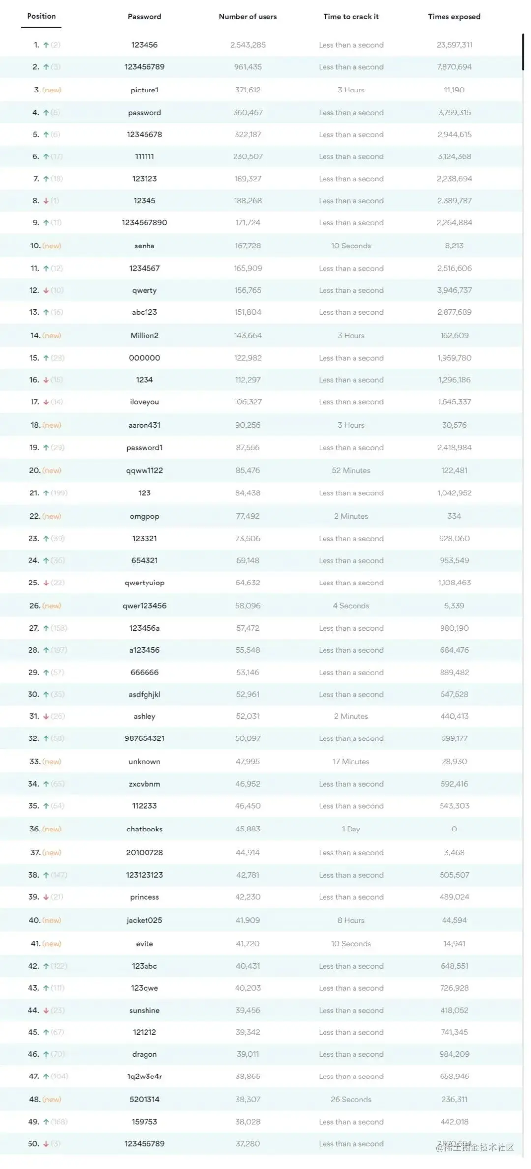 并且,2020年榜单中的密码有大约不到一半( 78 个)是新的,其他全是此前已经公布过的不安全密码。