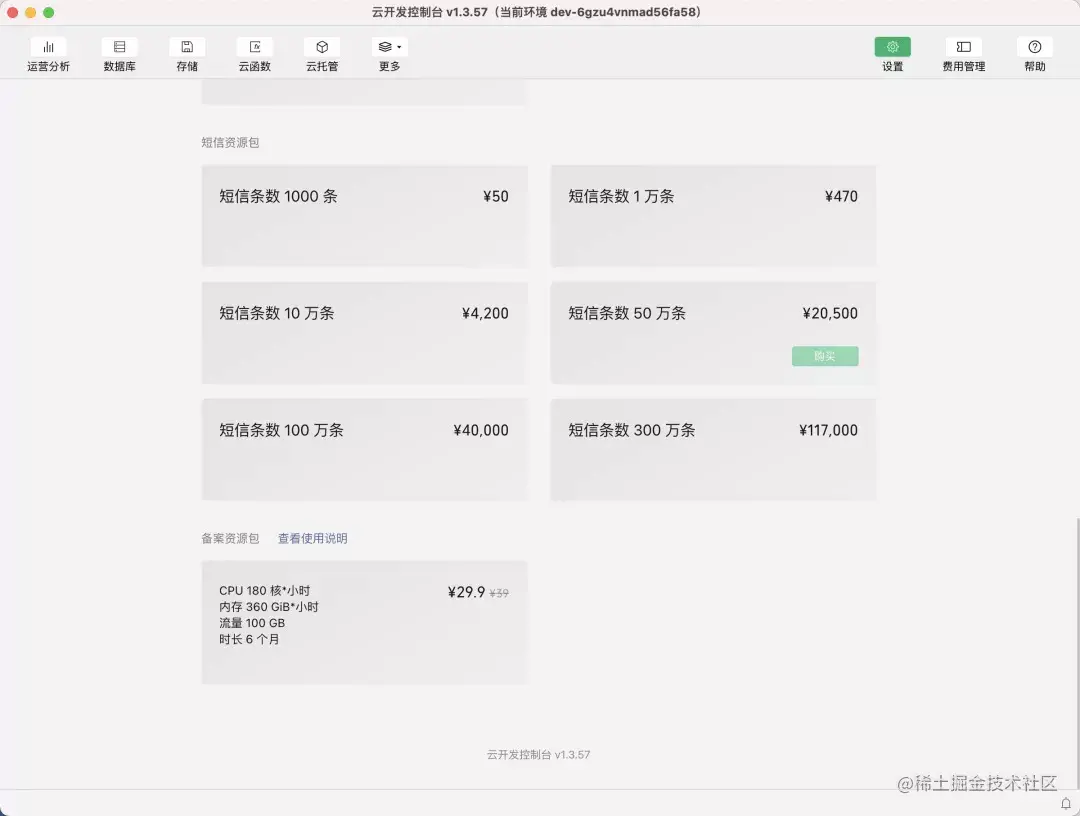 2. 在最新版微信开发者工具内,点击 云开发控制台-设置 进行选择适合您的短信资源包。