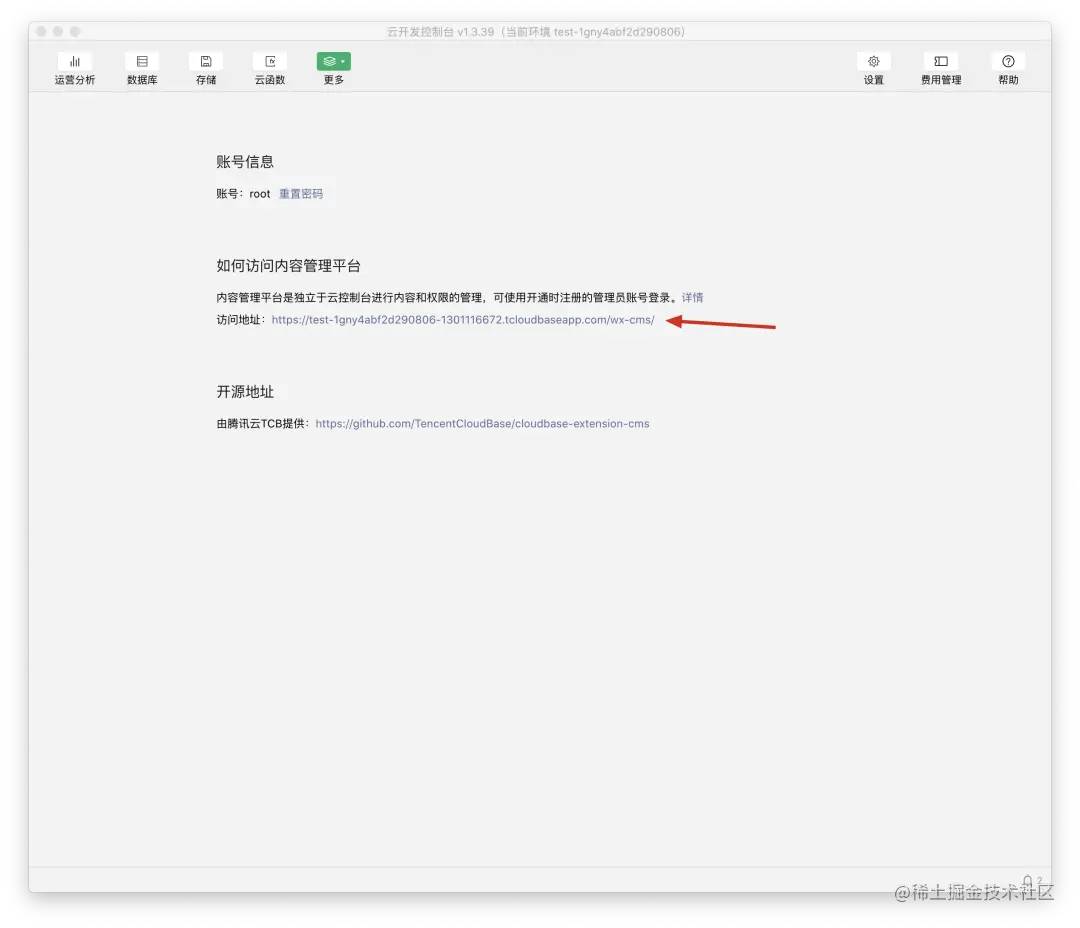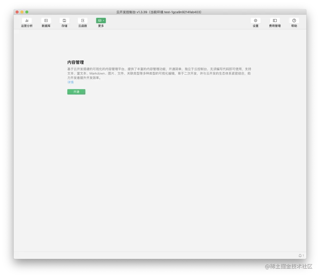 在微信开发者工具创建一个按量计费环境后,进入云开发控制台,在顶部导航栏中选择【更多-内容管理】,进入内容管理开通页面: