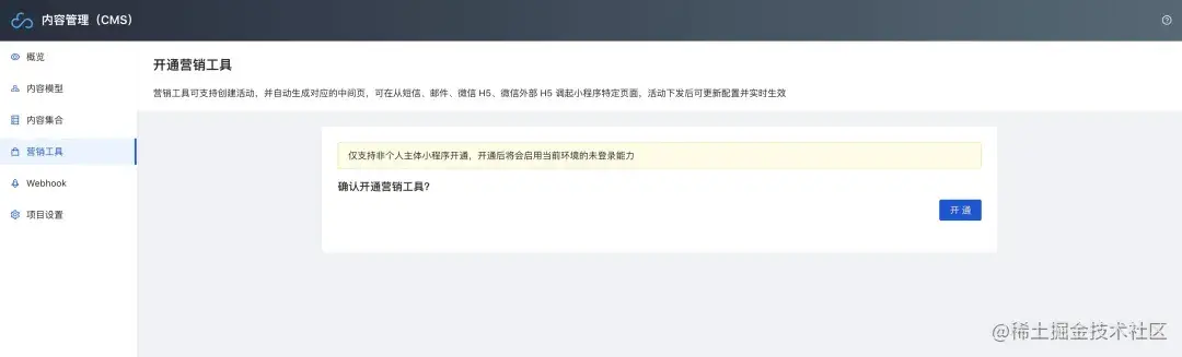 在内容管理 CMS 的任意项目中点击【营销工具】,一键开通。