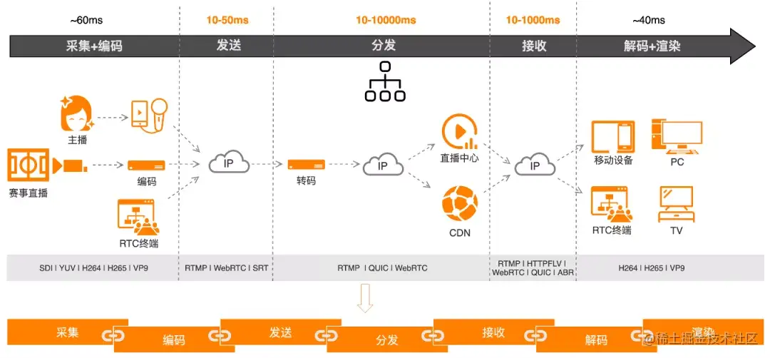 我们剖析直播延时的分布,在直播全链路可以分为7个步骤:分别是采集、编码、发送、分发、接收、解码和渲染。其中采集+编码,解码+渲染总体延时比较固定,共100ms左右,变动比较大的部分是分发和接收,从数十毫秒到数秒不等,主要取决链路时延抖动、协议栈的优化情况,以及CDN资源的覆盖情况。