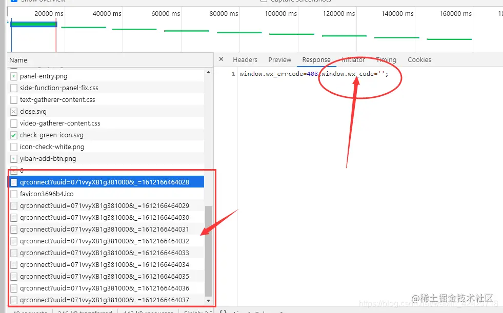 从上述截图我们看到了 uuid不断自增,这就是 浏览器在轮询微信服务器 。