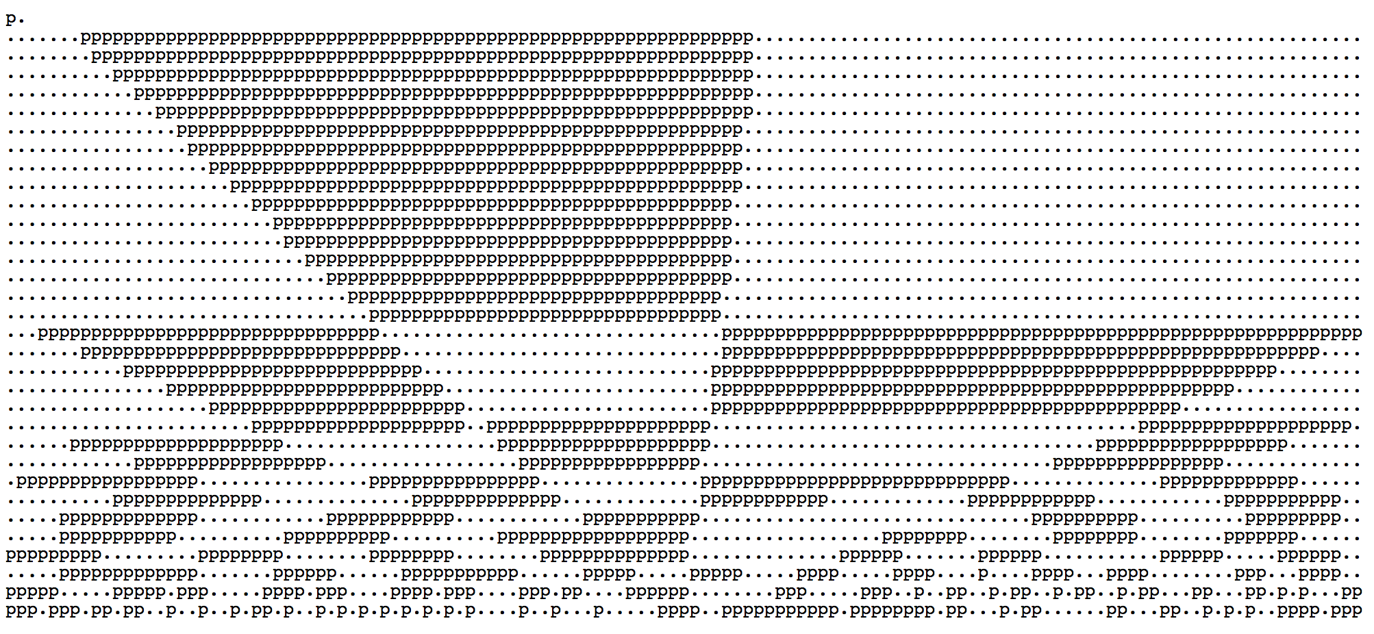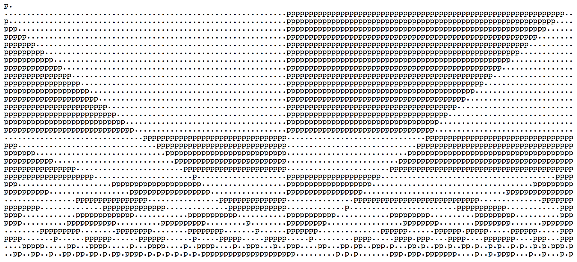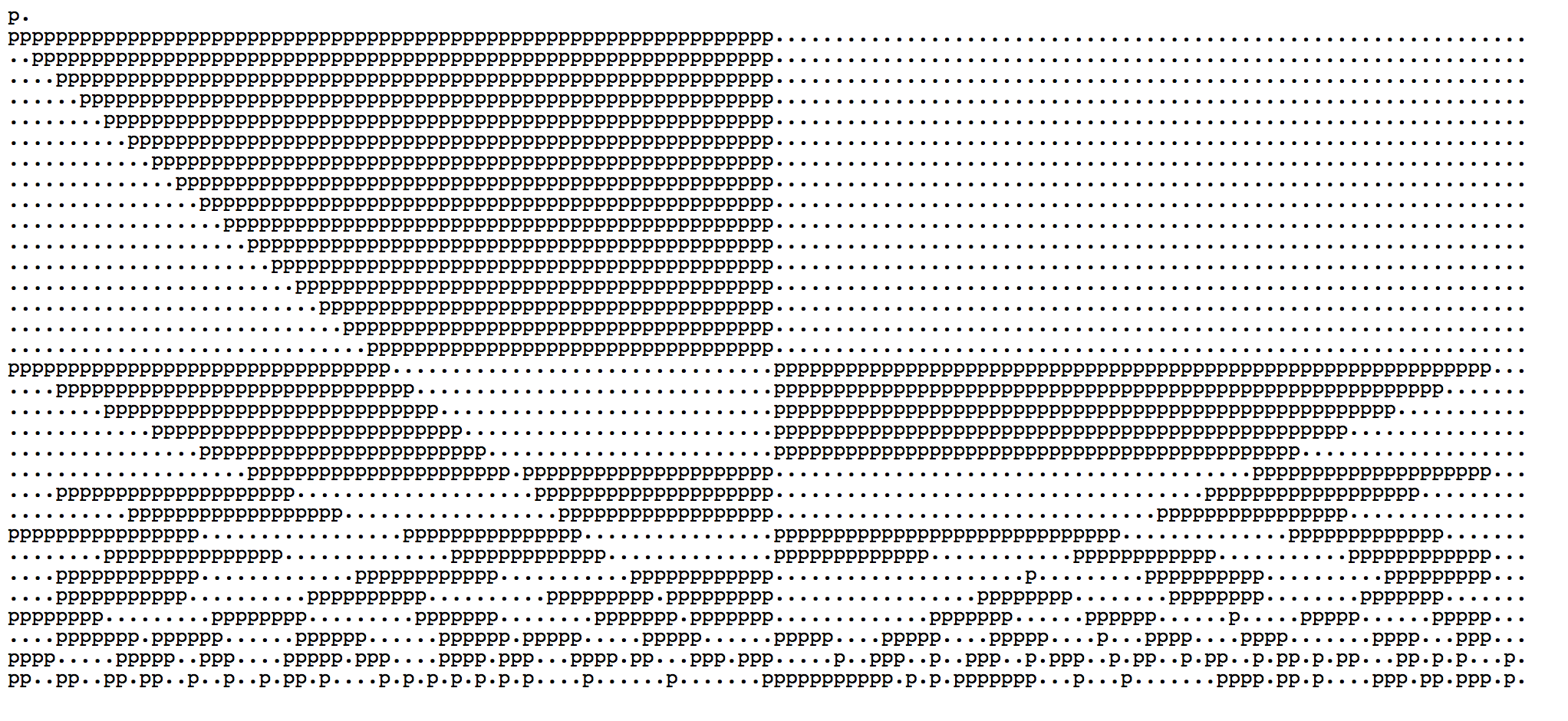 现在 `j` 的值趋近于 1,x 轴在 62 - 63 上的值为 0.x , 63 - 64 的值为 1.x。可推得在 63 - 64 时对角线的值是 (1 ^ 1 = 0 // even) 添加一串 `p`,62 - 63 时对角线的值是(1^0 = 1 // odd) 添加一串 `.`。