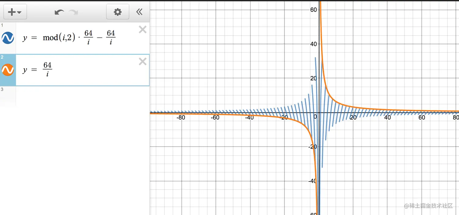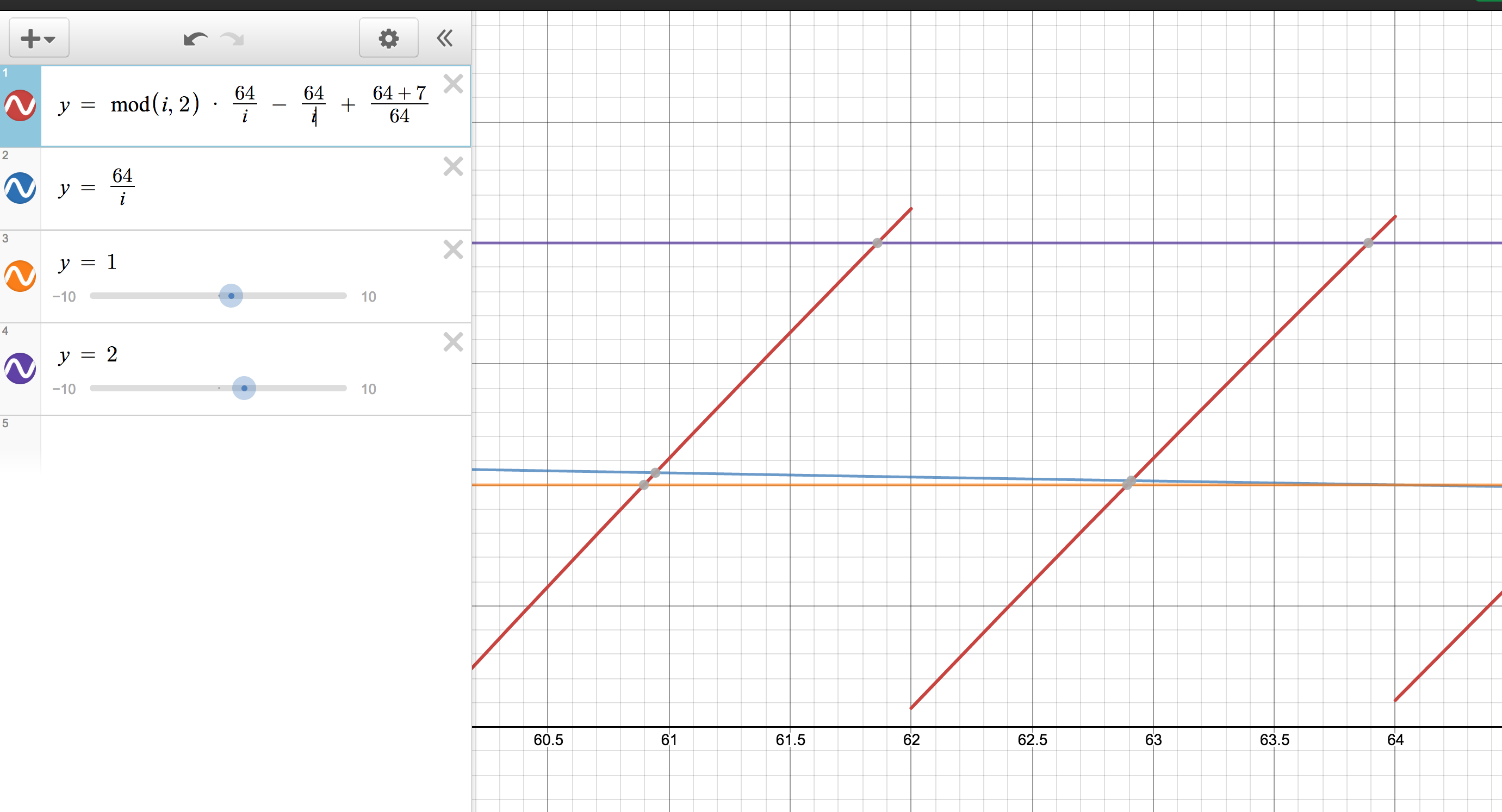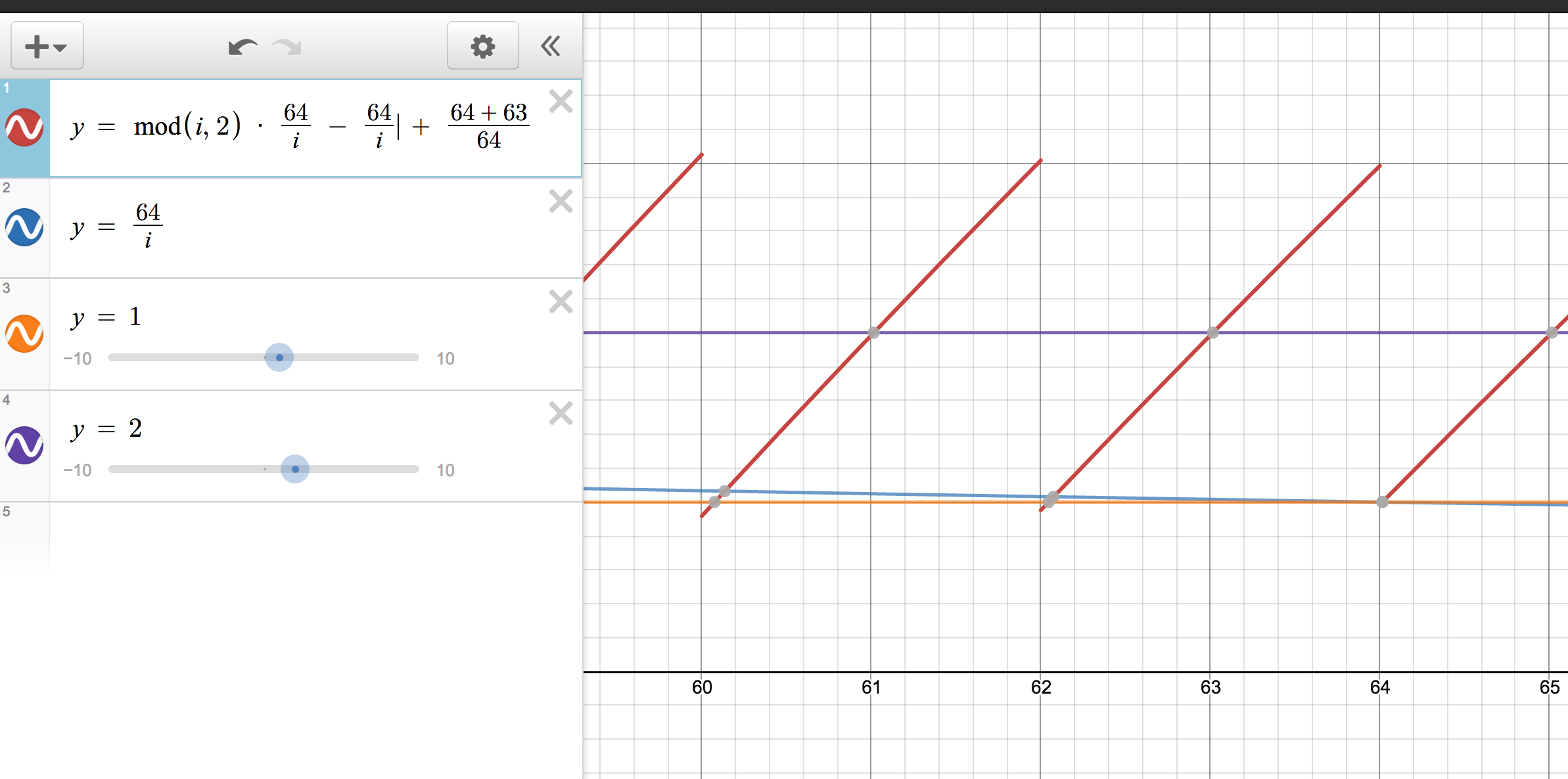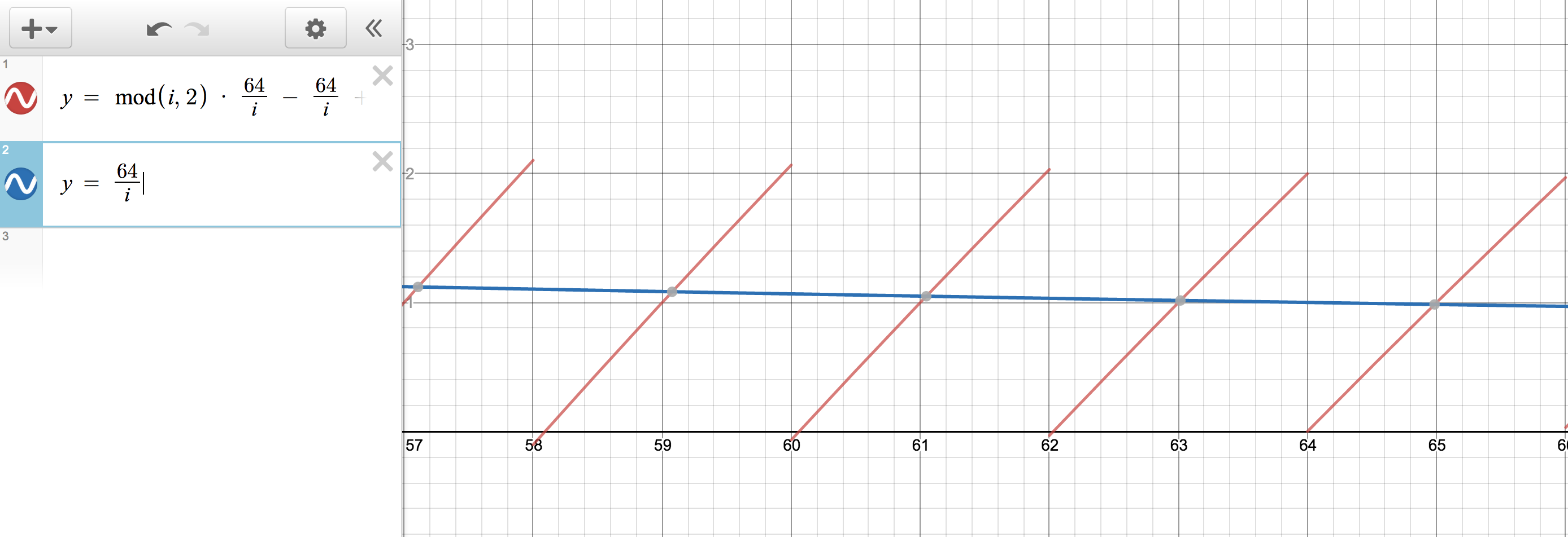 那么,我们就先在移除 + n/DELAY 的情况下进行探讨。对于 (i % 2 * j - j) ^ j 因为在每次循环中有: j = DELAY / i; 所以我们可以将式子简化为一元式:(i % 2 * 64/i - 64/i) ^ 64/i。