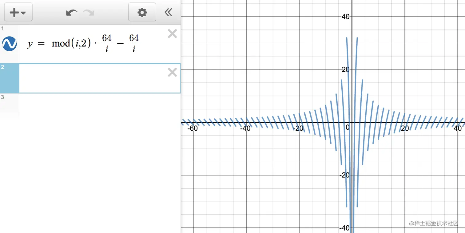 换句话说,每条蓝色的对角线代表着我们 Demo 图表中的一行。因为 `j` 在这 16 行里总是大于 1 而小于 2。我们得到奇数的唯一办法就是使式子 `(i % 2 * j - j)^ j` 即 `i % 2 * i/64 - i/64` 即蓝色的对角线应该处于大于 1 或小于 -1的范围。