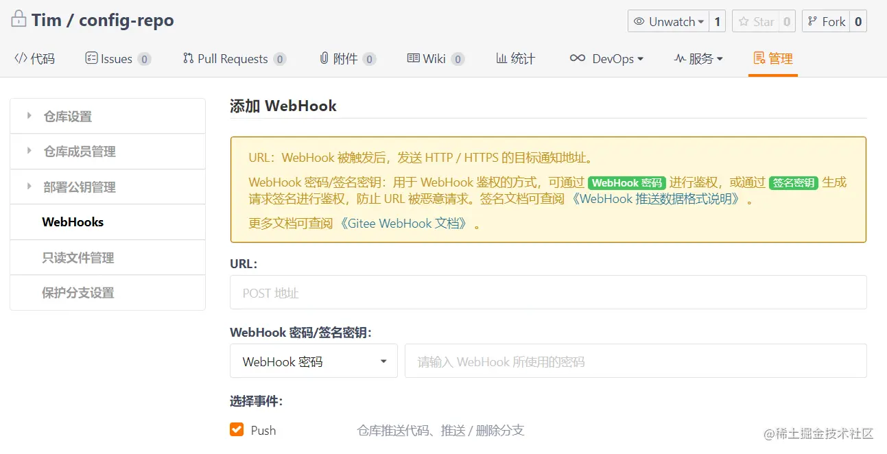 现在自动刷新就只差一步了,那就是配置 Git 的 WebHook,只要发生更新或者是其他事件,Git 托管平台便会自动访问我们的/actuator/bus-refresh 接口,从而自动刷新配置文件就完成了!