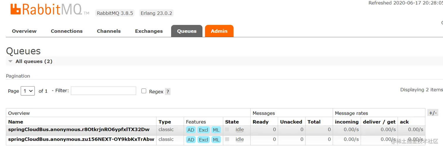 统一配置中心和 Client 启动后可以看到对应的消息队列: