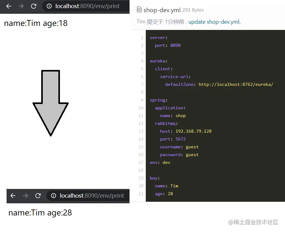 但是通常不这样使用,我们往往是把配置集中到一起,然后在配置类上面声明,假设现在 Git 仓库的 shop-dev.yml 配置如下: