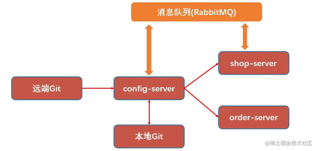 Spring Cloud Bus 提供了批量刷新配置的机制,它使用轻量级的消息代理(例如 RabbitMQ、Kafka 等)连接分布式系统的节点,这样就可以通过 Spring Cloud Bus 广播配置的变化或者其他的管理指令。shop 服务的所有实例通过消息总线连接到了一起,每个实例都会订阅配置更新事件。当其中一个微服务节点的 / bus/refresh 端点被请求时,该实例就会向消息总线发送一个配置更新事件,其他实例获得该事件后也会更新配置。