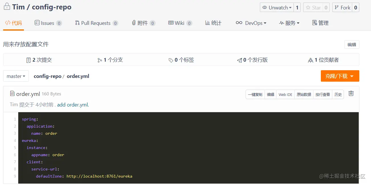 不难发现,我们在上面的配置文件中配置了 Git 的仓库地址、用户名以及密码,因为从架构图可以看出,其他服务组件配置文件需要放在一个 Git 仓库中,可以是 Github、GitlabGit、Gitee 或者是自己搭建的 Git 私服。我演示的时候直接放在了 Gitee(码云)上面: