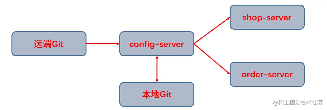 配置中心到时候也会作为一个服务,这些配置为了方便管理,我们都把它放到 git 上,使用 git 控制起来会比较方便。如下图所示,其中箭头代表数据流动的方向: