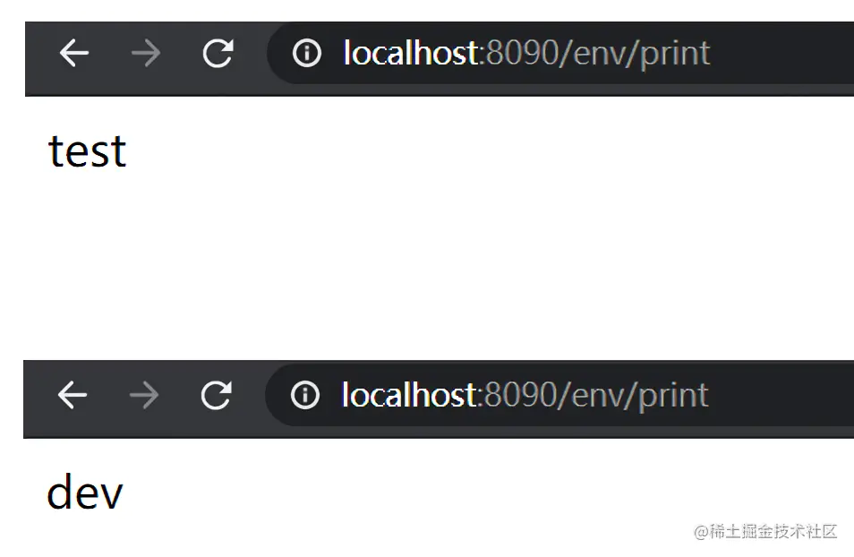 当我们把 bootstrap.yml 中的 profile 属性设置为 dev 的时候,拿到的配置文件就是 shop-dev.yml,此时访问打印环境属性的接口打印出来就是 dev;当我们把 bootstrap.yml 中的 profile 属性设置为 test 的时候,拿到的配置文件就是 shop-test.yml,此时访问打印环境属性的接口打印出来就是 test: