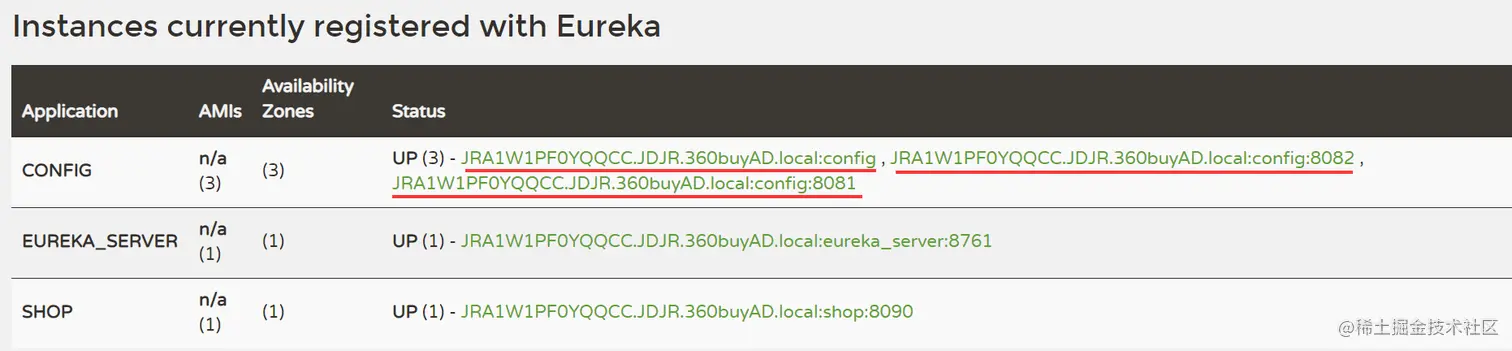 在 Eureka Server 的界面可以看到,三个配置中心的实例已经注册到了 Eureka Server 上面: