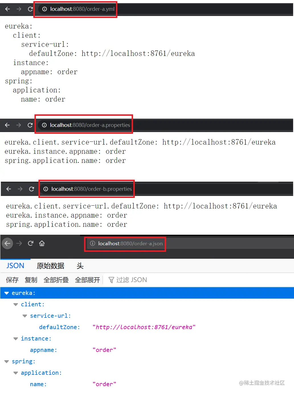另外还有一点需要注意,那就是如果你需要的配置文件是 shop-dev.yml,Git 仓库同时存在 shop.yml 与 shop-dev.yml,那么统一配置中心在拉取配置文件的时候,会把 shop.yml 和 shop-dev.yml 两个文件同时拉取下来,并且进行内容合并,所以我们通常遵循如下原则,那就是公共的配置内容写在 shop.yml(对于本例而言)中,不同环境的配置内容写在 shop-dev.yml 或者 shop-test.yml 中。