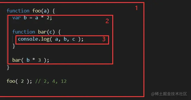气泡2: 包含 foo 所创建的作用域,其中有三个标识符: a, bar 和 b