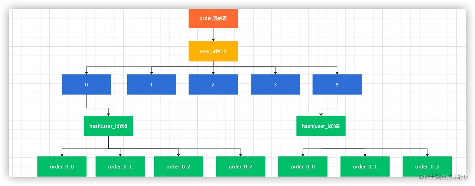 - 根据hash值及范围混合分片:先按照范围分片,再根据hash值取模分片。比如:表名=order_#user_id%10#_#hash(user_id)%8,即被分成了10*8=80个表。为了方便理解,我们画个图来说明,如图所示:
