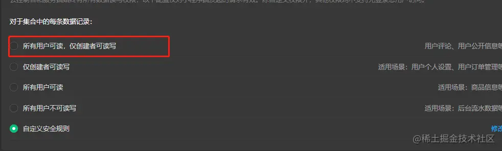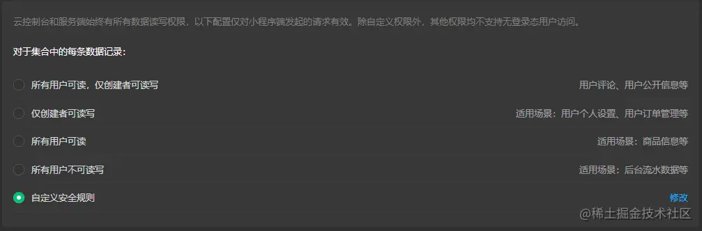 如果你是批量导又不想添加_openid字段的话,既然时因为权限问题,那就增加操作权限;打开云开发控制台,从控制台上选择操作数据表的数据权限配置如图: