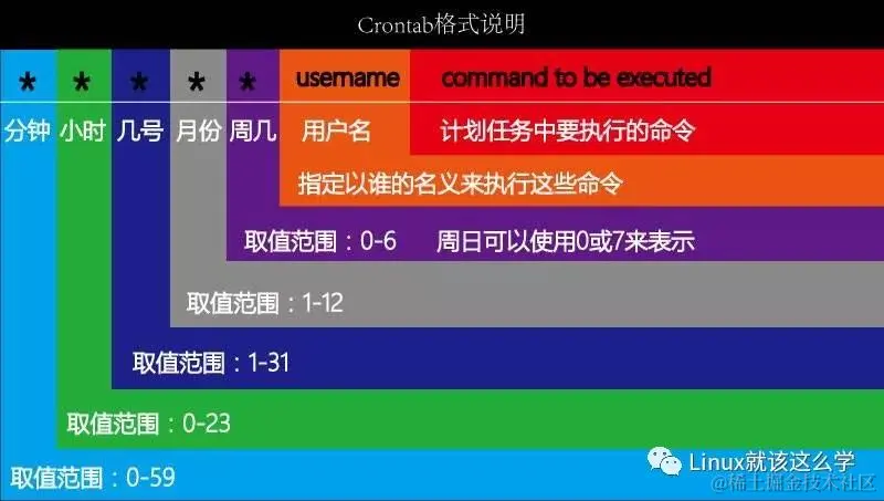 minute hour day-of-month month-of-year day-of-week commands合法值 00-59 00-23 01-31 01-12 0-6 (0 is sunday)